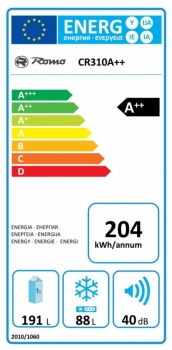 Základní informace En. třída A++ celkový hrubý objem 296 l hlučnost jen 40 dB čistý obj. chladničky 191 l, mrazáku 88 l (****) mrazící výkon 8 kg/24 h výdrž bez proudu 20 h skleněné police v chladničce chromový držák lahví antibakteriální vnitřní povrch spotřeba 0,56 kWh/24h, roční 204 kWh rozměry 176/60/65 cm (V/Š/H)