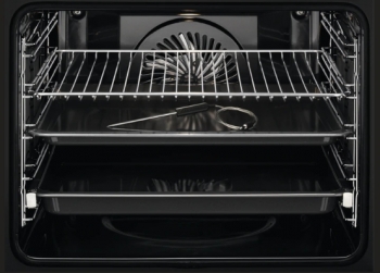 Výbava trouby - plechy: 1 smaltovaný koláčový plech na pečení, 1 hluboký odkapávací pekáč šedý smalt