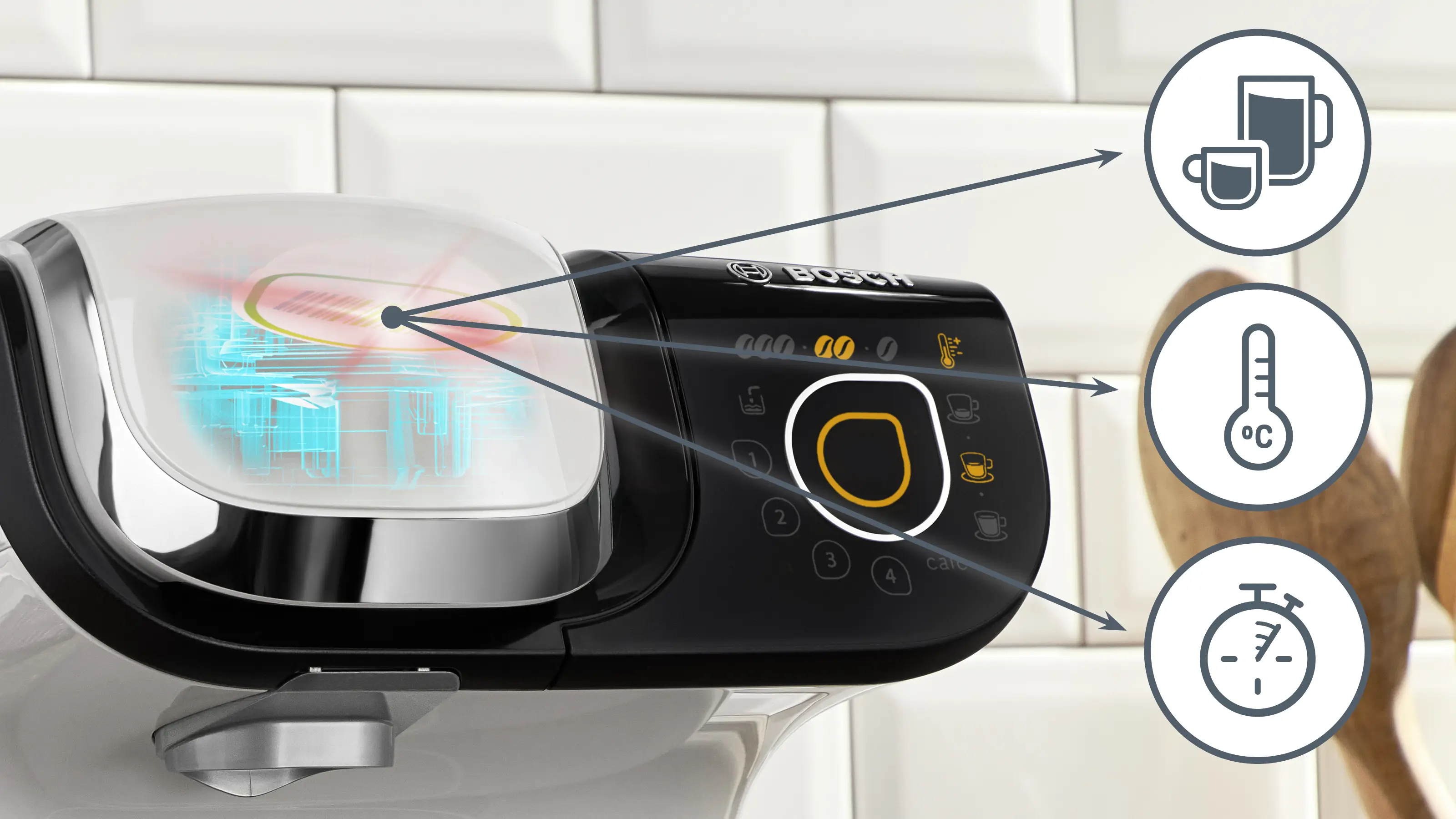 Patentovaná technologie INTELLIBREW™: přístroj sám rozezná a uvaří nápoj podle údajů, které si načte z čárového kódu na kapsli.