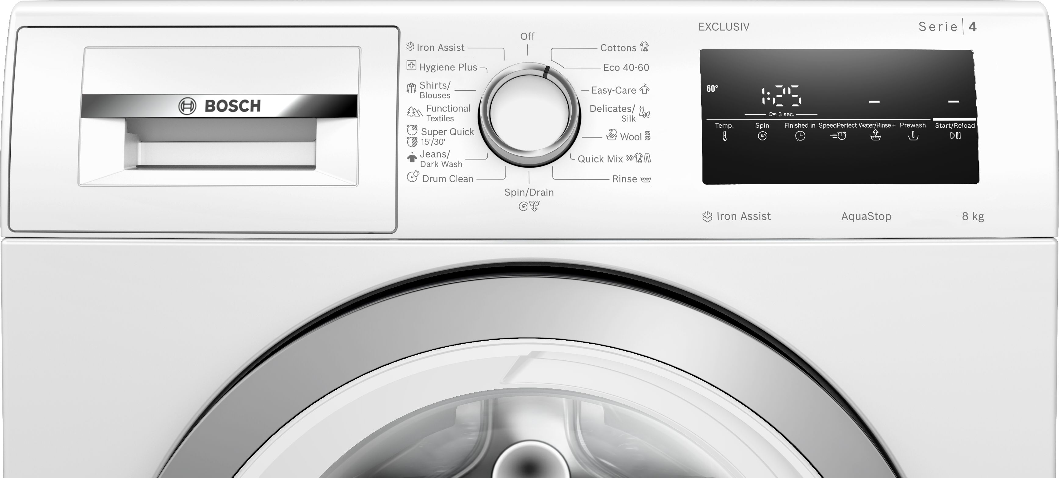 speciální programy: čištění bubnu s funkcí připomenutí, Iron Assist, košile/halenky, Hygiena Plus, džíny/tmavé prádlo, outdoor, odstřeďování/odčerpání, rychlý/mix, máchání, super rychlý 15/30, jemné/hedvábí, vlna/ruční praní