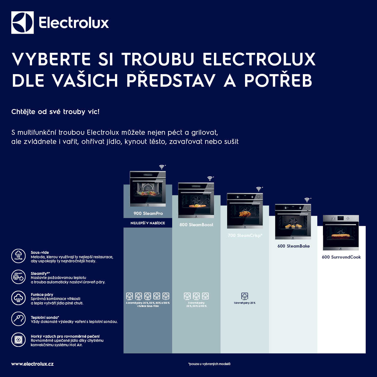 Možnost elektronického nastavení trouby: automatické vypnutí (jen trouby), přičítání času, Delayed start (Time delay), nastavení hlasitosti minutky, čas vaření s odhadem konce, čas vaření, nastavení jasu disp., demo program s kódem, alarm/hlášení chyb, Function lock (in running mode), Key tones menu with deactivation, Menu non-connected, Microwave Power level proposal, minutka, osvětlení trouby zapnout / vypnout (menu + samostatné tlačitko), info k servisu, denní čas, dveřní spínač pro světlo, Child lock (in off mode), 12 variety of pre-set cooking programmes "Assist", akustický signál