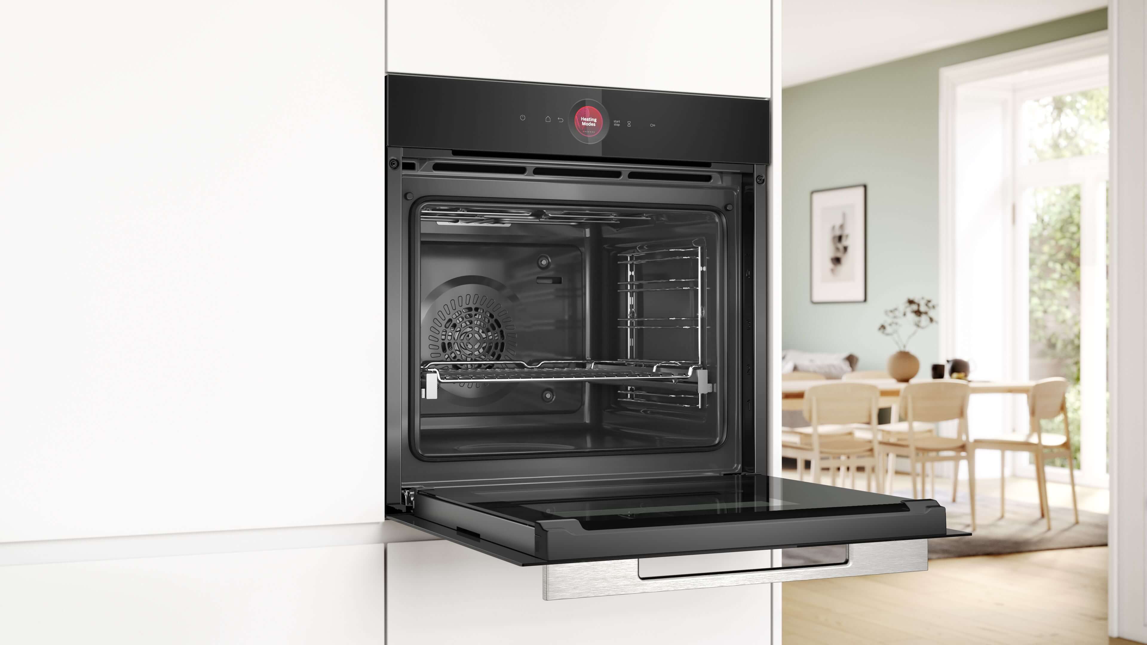 Pečicí trouba se 14 druhy ohřevu: 3D horký vzduch, horní/spodní ohřev, gril s cirkulací vzduchu, velkoplošný gril, maloplošný gril, stupeň pro pizzu, spodní ohřev, pomalé vaření, rozmrazování, předehřívání nádobí, udržování teploty, horký vzduch jemný, horní/spodní ohřev jemný, Air Fry