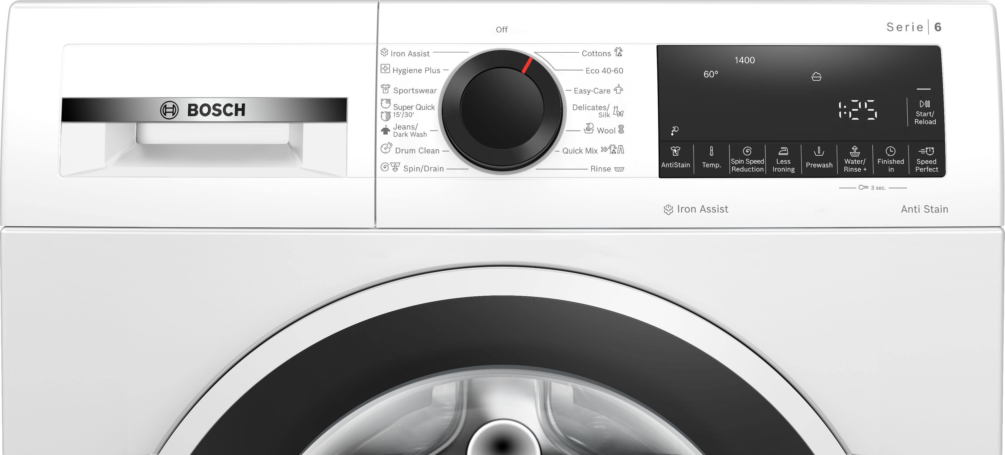 speciální programy: čištění bubnu s funkcí připomenutí, Iron Assist, Hygiena Plus, džíny/tmavé prádlo, odstřeďování/odčerpání, rychlý/mix, sport/fitness, máchání, super rychlý 15/30